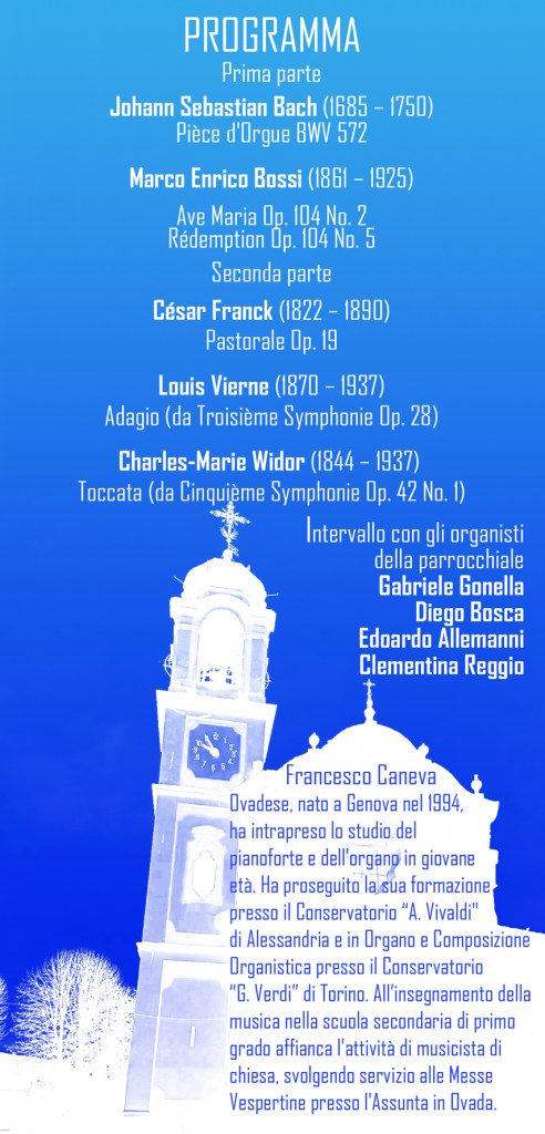 Lunedì 8 dicembre alle ore 21:00 il M° FRANCESCO CANEVA si esibirà in un concerto d’organo presso la chiesa parrocchiale di Bubbio.